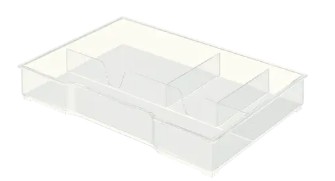 przezroczysty, błyszczący wygląd z teksturą na dnie oraz grawerowanymi symbolami pokazującymi możliwe opcje przechowywania dla każdej przegródki