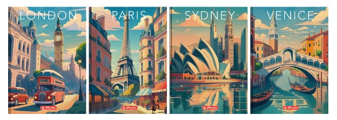 Ilustracje przedstawiające znane miasta w stylu retro